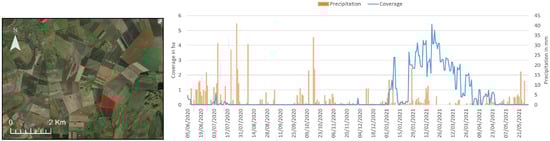The relationship between daily water maps and precipitation during the studied period of one year is illustrated on a selected parcel in Figure 6. It is clearly visible that no inundations (blue line) occur during the high precipitation (orange line) in the summer months, due to high temperatures, high potential evapotranspiration, and the high water absorption capacity of the crops. In autumn and winter though, rainfall is lower, but plant activity and temperatures are also lower, so evapotranspiration is also lower. When runoff, evapotranspiration, and infiltration are low enough, water remains on the surface (from 1 January to early April).
