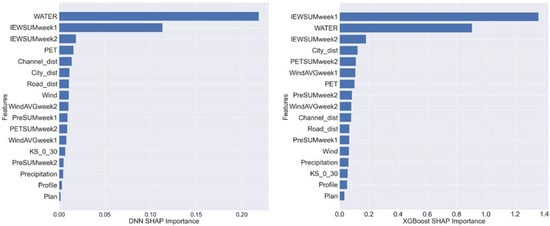 The calculation of the multicollinearity of the input features using VIF resulted in the exclusion of the PETSUMtmin1 and FC_0_30 variables, which had a VIF higher than 10 [54]. All other variables had a VIF value lower than four. Moreover, the SHAP analysis resulted in the exclusion of input features that had minimal impact on the training (Figure 7). The importance values show that, for both models, the surrounding water coverage (WATER) and the IEW inundation occurrences of the last week (IEWSUMweek1) and of two weeks (IEWSUMweek2) earlier are of decisive importance. The final models were trained with 17 input features.