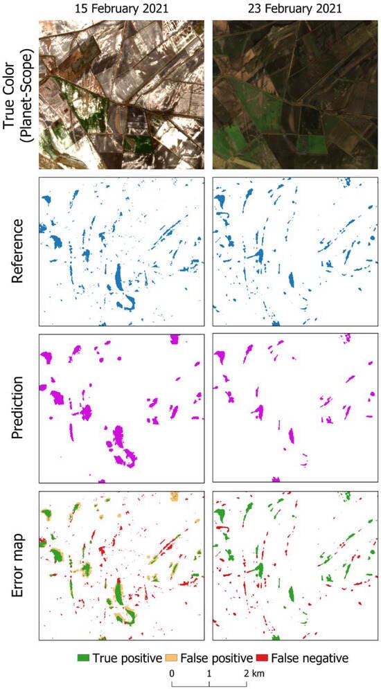 The XGBoost model outperformed the DNN in terms of both accuracy and performance. Consequently, it was employed to predict water coverage during a 9-day inundation period in the study area in 2021 (15–23 February 2021) (Figure 8). The prediction for the 15th of February was based on the water time series data that were derived from the satellite data. The consecutive days used the model predictions from the preceding days. A validation analysis was conducted between the predictions and used the separately calculated CNN-based water coverage maps as reference. The overall accuracy (15 February 2021: 0.97; 23 February 2021: 0.98), Cohen’s Kappa (15 February 2021: 0.55; 23 February 2021: 0.69), and F1 scores (15 February 2021: 0.56; 23 February 2021: 0.71) were calculated for the statistical evaluation of the water classifications. The confusion matrix prepared for the whole 1600 km2 study area is presented in Table 4.