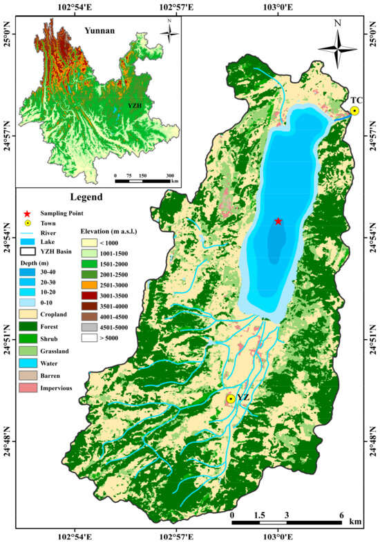 Lake Yangzong, located in the eastern part of the Yunnan Plateau (Figure 1), covers an area of 31 km2 with a watershed area of 192 km2. It has a maximum depth of 31 m and an average depth of 20 m, making it the third deepest lake in Yunnan. Lake Yangzong is a typical faulted deep-water lake. The outcrops of its watershed are primarily composed of Permian, Carboniferous, and Devonian limestone and basalt, followed by sandstones from the Cambrian, Jurassic, and Silurian periods. The areas of the basin’s northern and southern shores predominantly expose Quaternary fluvial–lacustrine facies [45]. The region experiences a subtropical plateau monsoon climate, with an annual average rainfall of 900 mm, characterized by distinct wet and dry seasons. The lake’s water is mainly replenished by precipitation. In addition to the rainy season’s runoffs, the primary sources include the Yangzong River, Qixing River, and other seasonal streams from the east and west sides, with the Tangchi Canal on the northeast side serving as the only outlet. The predominant soil type in the watershed is lateritic soil, which has a high dispersion coefficient and is relatively light in texture [46]. The vegetation in the Lake Yangzong watershed is characteristic of the subtropical zones on the Yunnan Plateau, dominated by evergreen broad-leaved forests and Yunnan pine forests, with a significant proportion of farmland [3]. Since the mid-20th century, human activities in the watershed have intensified, with rapid development in industry, agriculture, and tourism, leading to a noticeable deterioration of the ecological environment [47].