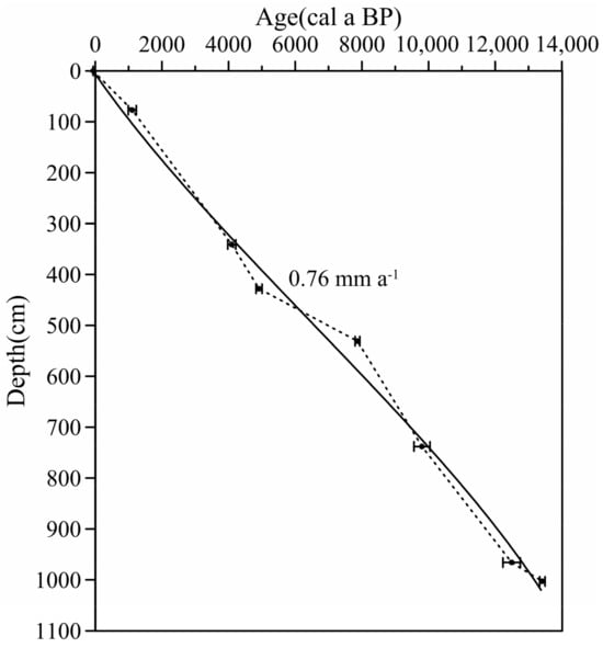 The YZH-1 core from Lake Yangzong mainly consists of clayey silty sand. The top 62 cm is brownish-red clayey silty sand, followed by a layer of light-gray silty sand from 62 to 392 cm and a lower layer of dark-gray sandy silty sand from 392 to 1020 cm. The age framework of the Lake Yangzong drilling core was established using AMS-14C dating data from seven wood and leaf samples, along with the set top age of the core (−63 cal a BP (calibrated years before the present). The age boundary at the bottom of the core reaches 13,300 cal a BP, with an average sedimentation rate of 0.76 mm a−1 (Figure 2).
