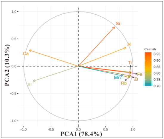 Principal component analysis was conducted on the elemental data of Fe, Mn, Ti, Al, Si, Zr, Sr, Ca, Rb, etc., obtained from the XRF scanning of the YZH-1 sediment core. The results show that there are two significant PCA axes influencing the behavior of elements in Lake Yangzong, explaining 78.4% and 10.3% of the element data (Figure 3), with a cumulative variance accounting for 88.7% of the total variance, which can effectively explain the information in the original data. In the PCA biplot of the elements, the magnitude and proximity to the axis of the loadings on the component axis reflect the strength of the element responses. The longer the distance and the closer to the axis, the greater the influence of the element, and elements that are closer to each other on the plot denote a more significant relationship between them.