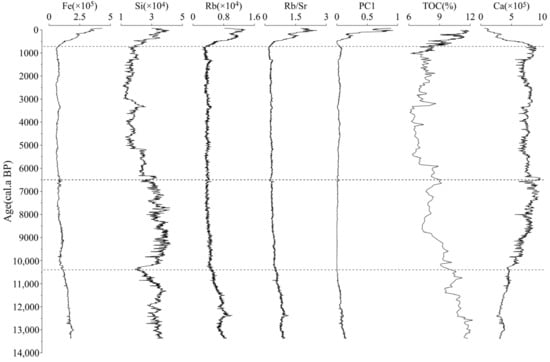 Through correlation analysis and principal component analysis of the XRF scanning elements of the YZH-1 core sediment from Lake Yangzong, the sediment elements can be classified into two categories. Elements such as Fe, Ti, Rb, Zr, and Mn represent terrestrial detrital materials, reflecting the erosion intensity of the Lake Yangzong basin. Elements Ca and Sr represent endogenous materials produced by chemical and biological processes within the lake. The correlation between TOC content and elements like Fe is high, indicating the input of terrestrial detritus and organic residues in the basin. As shown in Figure 4, during the Last Glacial Termination period (13,400–10,400 cal a BP), the sediment in Lake Yangzong showed higher levels of terrestrial detrital elements like Fe and TOC, both of which exhibited a decreasing trend, while the Ca content was lower with a fluctuating increasing trend, revealing poor climatic conditions characterized by cold temperatures [60], vegetation degradation in the basin, severe surface erosion, and reduced precipitation of calcium carbonate in the lake water. From 10,400 to 680 cal a BP, the overall period was in the Holocene warm period, with significantly higher temperatures and precipitation compared to the cold periods [30], reflecting very low and stable erosion intensity in the basin. The TOC content also continued to decrease and remained at low levels, suggesting high vegetation cover and low erosion intensity in the Lake Yangzong basin during this period. The variation in Ca content was completely opposite to PC1, showing an initial increase in volatility followed by a stable period. During this time, the average Ca content was the highest, mplying an increase in the lake autochthonous carbonates under high-temperature climatic conditions [24]. The characteristics of the changes in XRF scanning elements and TOC content in the Lake Yangzong sediments show that the fluctuations in element and organic-matter content in the above two stages correspond to the stages of climate evolution, mainly controlled by climate and the resulting surface vegetation succession, with human activity signals being insignificant and having a very weak impact on the vegetation cover and erosion intensity in the basin.