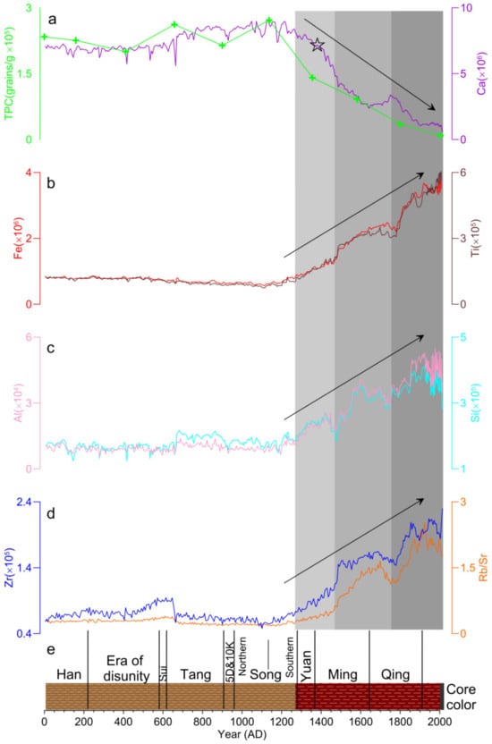 Proxies from YZH-1 over the last 2000 years: (a) Total pollen concentration [3] (TPC, green line) and Ca values (purple line), the symbol ☆ represents the era in which the Tangchi Canal was constructed; (b) values of Fe (red line) and Ti (brown line); (c) Al values (pink line) and Si values (cyan line); (d) Zr values (blue line) and ratio of Rb to Sr (orange line); (e) lithology and color of YZH-1 core, black lines are the Chinese dynasties. Gray bars indicate the gradual increasingly intensive human impact on the lake.