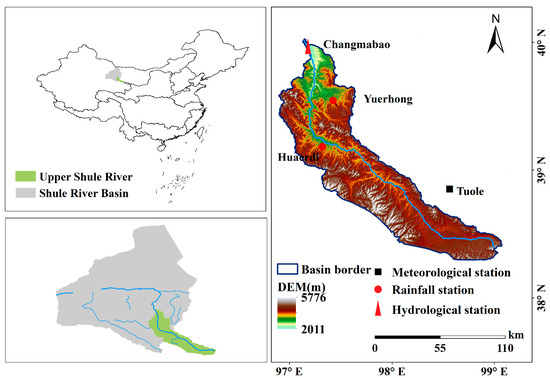 The Shule River is located in the arid inland regions of northwest China and Qinghai-Tibet Plateau (92°11′–98°30′ E, 38°00′–42°48′ N), with a standard continental drought climate [28,29]. The area of the Shule River Basin is 4.13 × 104 km2, which is the second largest river in the Hexi Corridor of Gansu Province. The main sources of recharge in the Shule River basin are seasonal snow, glacial meltwater, and rainfall, with large seasonal and interannual changes, and more than half of the annual water volume comes from the flood season [19]. Water resources in the Shule River Basin mainly originate from the Qilian Mountain area, and the change in runoff in the upper reaches directly influence the exploitation and utilization of water resources in the middle and lower reaches. Therefore, the area above the Changmabao hydrological station (96°51′ E, 39°49′ N), which covers 10,961 km2, was selected as the study area (Figure 1). The permafrost cover is 83% and the glacier area is 5% of the catchment area [30]. The main vegetation types in the Upper Shule River are alpine meadows, alpine grasslands, and desert grasslands, and the vegetation coverage is generally 40–80% [31,32]. Furthermore, dominated by the typical continental arid climate, the Upper Shule River is a typical water-shortage area with mean annual precipitation is 209.2 mm, annual mean temperature of about 1.73 °C, and potential evapotranspiration of up to 400 mm per year.