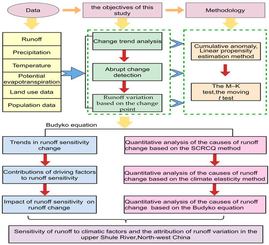 In this study, hydro-meteorological data from 1972 to 2021, including monthly and annual precipitation time series, mean temperature, potential evapotranspiration, and runoff, were analysed. Monthly runoff, precipitation, and temperature data series during 1972–2021 from the Changmabao hydrological station and Yuerhong rainfall station were collected from the Gansu Hydrological Station. Notably, the collected precipitation data included rainfall and snowfall. All the original runoff data used in this paper are complete. The land use data, spatial distribution of population data and daily data from the Tuole meteorological station were obtained from the Data Center for Resources and Environmental Sciences, Chinese Academy of Sciences (https://www.resdc.cn/ (accessed on 12 October 2022)). The quality of the meteorological data was firmly controlled before its release. The missing data accounted for less than 1% of the total data and were processed using the 10–year moving average method. Potential evapotranspiration was calculated via the Thornthwaite method [33]. The methodological framework of this research is shown in Figure 2.