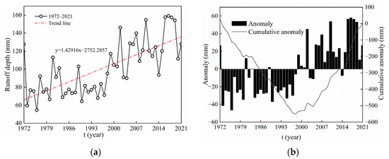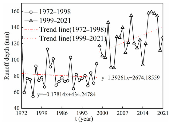 The annual runoff depth from 1972 to 2021 was divided into two stages based on the change point: 1972 to 1998 (baseline period) and 1999 to 2021 (post-baseline period). As shown in Figure 5, there was a difference in the annual runoff depth change between the two periods. In the baseline period, the annual runoff depth showed a decreasing trend, while in the post-baseline period, the annual runoff depth showed an increasing trend. The annual mean runoff depth in the post-baseline period was 44.4 mm, which is greater than the annual mean runoff depth in the baseline period.
