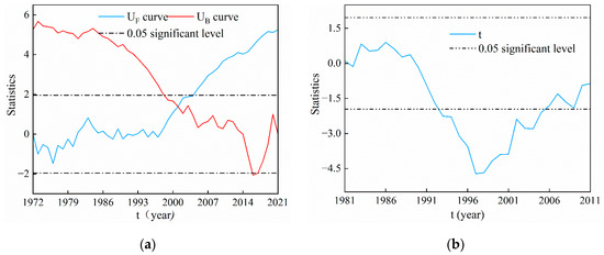 Detection of mutations of annual runoff depth in the Upper Shule River from 1972 to 2021. (a) Abrupt change time determined by the M-K test; (b) Abrupt change time determined by the moving t test.