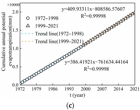 Relationships between year and cumulative hydrological elements in the Upper Shule River from 1972 to 2021. (a) Relationship between year and cumulative runoff; (b) relationship between year and cumulative precipitation; (c) relationship between year and cumulative potential evapotranspiration.
