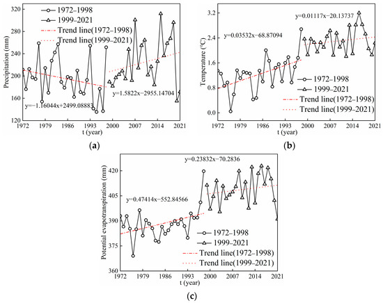 Variation trends in annual meteorological parameters in the Upper Shule River during the baseline period and post-baseline period. (a) Temporal variation in precipitation. (b) Temporal variation in temperature. (c) Temporal variation in potential evapotranspiration.