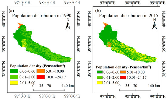 The dominant land use types of Upper Shule River were unused land and grassland. There were two main trends of land use changes during 1990–2015: the decrease in grassland and the increase in unused land (23 km2 and 22 km2, respectively) (Table 6). However, the area changes in grassland coverage and unused land were only 0.26% and 0.16%, respectively, which contributed a small part to the increase in runoff. The literature reports that the area of grassland decreased, and the area of unused land increased, which promoted an increase in runoff [6]. Furthermore, the population density in the Upper Shule River was low during 1990–2015 (Figure 9). The changes in population density and the land use types indicated that human activities were not dominant in the Upper Shule River.