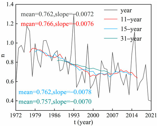 Trends in the 11-, 15-, and 31-year moving averages of characteristic parameters of underlying surface (n) in the Upper Shule River from 1972 to 2021. The unit of slope of n is yr−1.