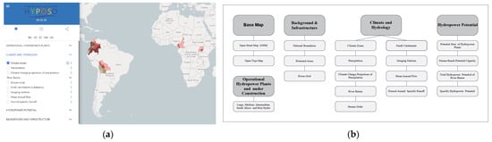 Desktop interface of the HYPOSO hydropower atlas (a) and key layers (b).