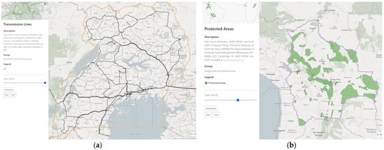 Two types of base maps can be switched on/off: OpenStreetMap and OpenTopoMap (Figure 1a). For individual countries, the transmission and distribution of power lines (in some countries, even substations) are visualised on the map (Figure 2a) along with the protected areas, as outlined in [] (Figure 2b).