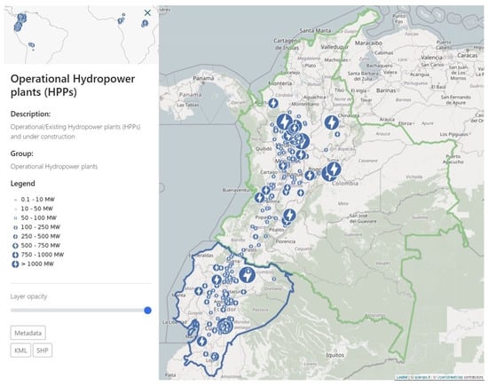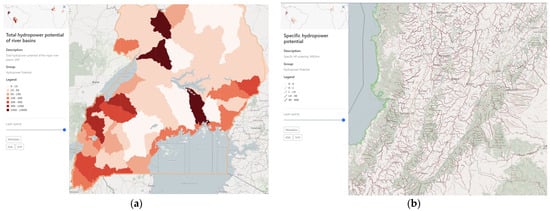 GIS-based hydropower resource mappings are available in select regions across the African continent and within individual countries. Examples include West Africa, Tanzania, and Madagascar [,,], where these mapping initiatives provide valuable insights into hydropower potential and distribution. However, there were no such web-based hydropower atlases in the countries under study (Cameroon, Uganda, Bolivia, and Ecuador) except for Colombia. Colombia’s hydropower atlas operates on the ESRI ArcGIS online platform [].