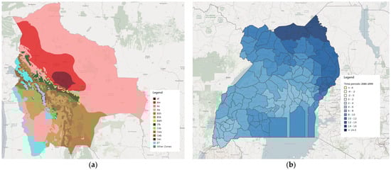 Climate zones in Bolivia (a) and climate change projections of precipitation (mean projections—CMIP6 and scenario SSP2–4.5) in Uganda (b).