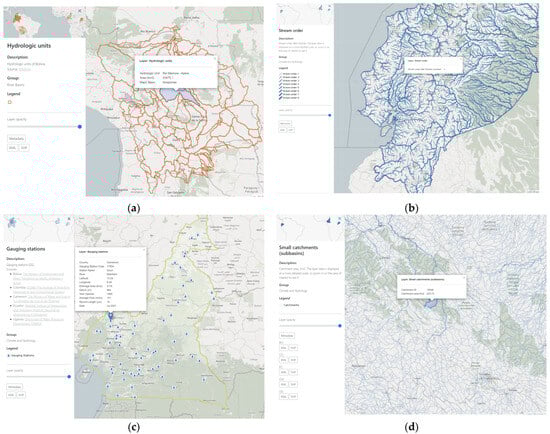 Hydrologic units (geospatial polygons) of Bolivia (a) and rivers and streams (geospatial polyline layer) with the Strahler stream order highlighted in Ecuador (b). River and stream gauging stations (GS) network in Cameroon (c). An extract of the small catchment area generated from the DEM in Bolivia (geospatial polygon layer). (d). A pop-up with a catchment area of 220.73 km2 is highlighted.