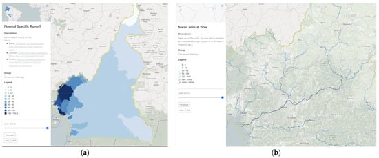 Normal annual specific runoff (geospatial polygon layer) (a) and the mean annual flow of the rivers (geospatial polygon layer) in Cameroon (b).