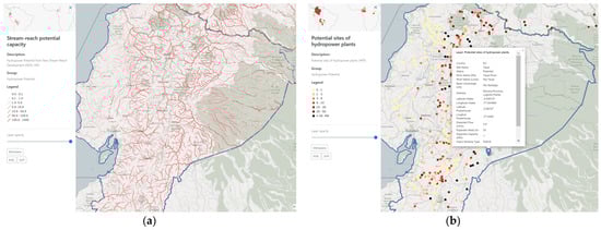 Hydropower potential from new stream-reach development (NSD), MW (geospatial polyline layer) (a), and potential sites of hydropower plants in Ecuador (geospatial point layer), with a pop-up window showing key features of a site (b).