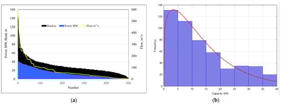 Nevertheless, a geospatial analysis of hydropower potential in Uganda reveals that the combined hydropower potential of such small-sized streams (first- and second-order) amounts to approximately 18%. Nevertheless, the average power capacity per water course remains relatively modest, varying between 0.26 and 1.23 MW. It is worth noting that there may be exceptions for specific creeks with steep topography, which possess significant water drops in altitude or riverbed slopes despite having a low flow rate, potentially resulting in a relatively high power capacity []. This statement is substantiated by the contribution of the head term expressed in a general form of the hydropower Equation (1).