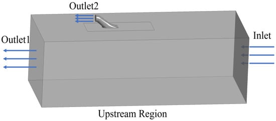 . The fluid was ideal water at 25 °C. The inlet boundary condition was defined by a velocity normal to the entry point, with the initial velocity profile established by Equation (7). This actual velocity at the inlet accounted for the ship’s speed and included a consideration of the velocity gradient due to the boundary layer beneath the hull, calculated using the Wieghardt equation [