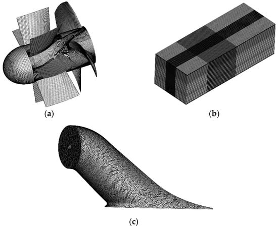 In the vessel’s reference frame, the intake duct was designated as a non-moving frame, while the drive shaft was configured to rotate relatively at a speed of 1450 rpm. The upstream region was also set as a stationary frame, but the side and lower walls of the domain below the hull were set as relative motion (30 knots). The impeller domain was set as the rotating frame with a design shaft speed of 1450 r/min, where the hub and blades were set as relatively stationary while the casing was absolutely stationary. The stator and nozzle were also set as a stationary frame, where body surfaces were set as absolutely stationary. At the upstream region’s outlet, an average static pressure was set as a boundary condition, and the nozzle’s outlet was designated as an opening. During the calculation, the high-resolution scheme was used for the convection terms, while the central difference scheme was used for the diffusion terms. The convergence precision was based on reducing the maximum of the normalized residuals of the momentum and continuity equations to less than