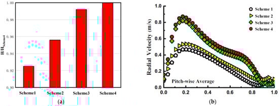 Figure 15b. The reduced curvature radius of the deviated streamlines leads to an increase in centrifugal force, counteracting the original static pressure. This interaction decreases the static pressure on the suction side of blade 2, which explains the observed phenomenon in
