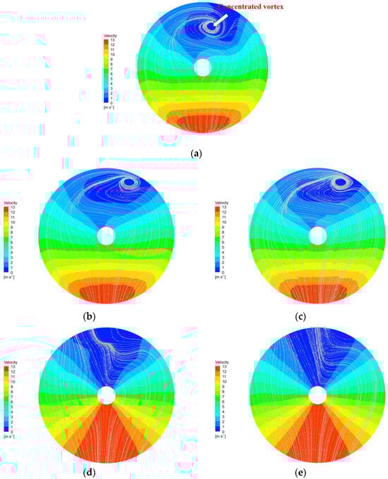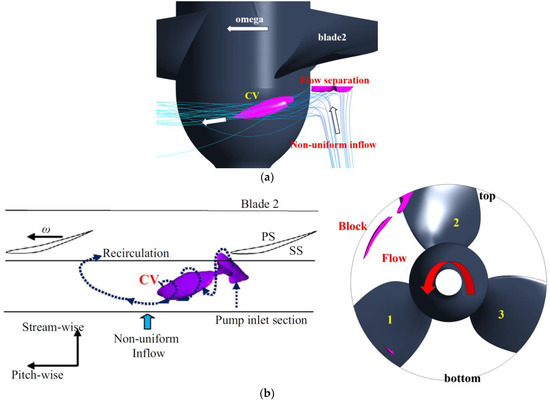 Figure 7a) above the inlet flow surface and the impeller induces flow separation due to an adverse pressure gradient at the impeller inlet, resulting in stagnation of the interfering fluid. Furthermore, the rotational motion of the impeller promotes circumferential movement, entraining the surrounding fluid and eventually generating a circumferential vortex (CV), as shown in