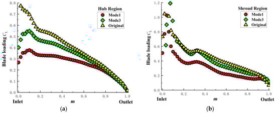Figure 10b is a comparative graph of the load coefficients for blade 2 at the shroud among mode 1, mode 3, and the original flow field. Compared to the original flow field, mode 1 shows a 20% reduction in the load coefficient across the entire shroud flow surface, whereas mode 3 exhibits a 9% reduction merely within the range of 0.4 ≤
