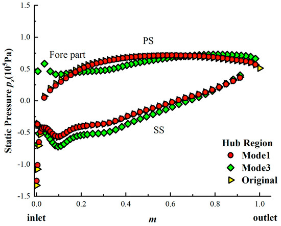 Figure 11 illustrates the static pressure distribution curves at the hub section of mode 1, mode 2, and the original. Where m denotes the spanwise coefficient, extending from 0 to 1, signifying a direction from outlet to inlet.
