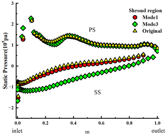 Figure 12 presents the static pressure distribution profiles of blade 2 at the shroud for modes 1, 3, and the original, respectively. Contrasting the static pressure distributions at the hub, the variances in static pressure at the shroud between the two modes predominantly manifest on the SS. In mode 3, the static pressure on blade 2 is significantly lower than that of the original across the full flow span (0 ≤