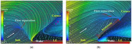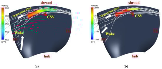 Figure 14). The CSV entrains surrounding fluid, causing the streamlines at the shroud of blade 2 to deviate from the suction side and move circumferentially towards the pressure side of an adjacent blade, as illustrated in