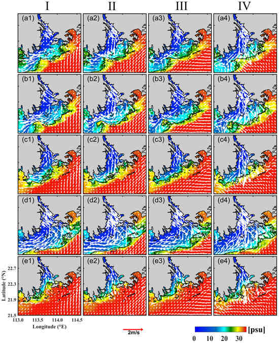 The results of Exp2 (Figure 7b1–b4) indicate that as the river discharge increases, the current velocity of the entire current field increases, and the diffusion area of the plume expands. The volume of the surface-advected plume on the west coast increases, the anticyclonic flow formed by the tidal plume is clearer compared to Exp1, the plume bulge is more evident and its position moves southward, reaching up to 21.7° N. At Moment II (Figure 7b2), the increase in river discharge leads to a greater accumulation of freshwater within the bulge and a corresponding increase in the amount of freshwater carried out by the ebbing tide. The location of the anticyclonic flow in the southwestern part of the Dawanshan Islands is further southward and the current velocity is increased. At Moments III and IV (Figure 7b3,b4), a cyclonic flow occurred near 113.3–113.5°E, resulting in the storage of some high-salinity seawater. The results of Exp3 (Figure 7c1–c4) show that when the river discharge decreased to half of that in Exp1 (11,720 m3/s), the overall salinity outside the PRE increased. The velocity and volume of the tidal plume significantly decreased, with freshwater with low salinity primarily flowing out along the western coast to form a surface-advected plume. The 25 isohaline contour line is located near the Dawanshan Islands, with no plume bulge formation. The result is consistent with the observations of Li et al. [30] but different from the model results of Pan et al. [23]. Under the extreme river discharge condition of Exp4 (Figure 7d1–d4), the salinity distribution outside the PRE remained essentially unchanged over time. The momentum of the freshwater sharply increased, with all the water exiting the estuary moving westward, as far south as 21.6° N. There is no plume bulge observed. Exp5 indicates that under average dry season river discharge conditions, current velocity is relatively low throughout the whole region (Figure 7e1–e4). The freshwater is essentially confined within the estuary and does not flow outward, a plume bulge is not formed.
