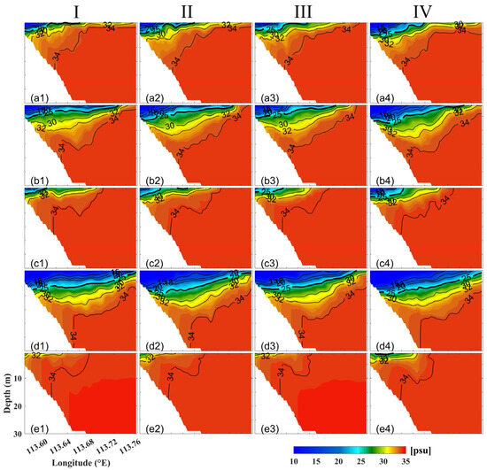 Vertical salinity distribution in Section B, shown in Figure 1, (a1–a4,b1–b4,c1–c4,d1–d4,e1–e4) represent Exp1–Exp5, respectively.