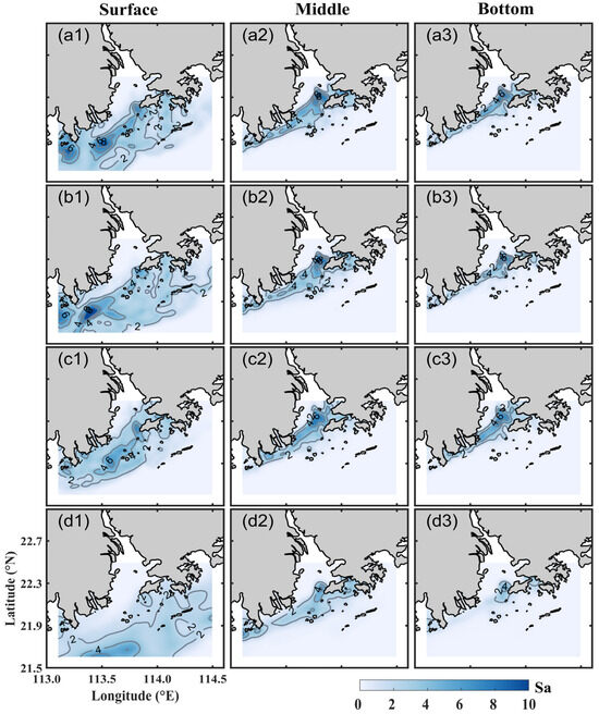 Distribution of SA in PRE. Each column from left to right represents the surface, middle, and bottom layers, respectively. (a1–a3,b1–b3,c1–c3,d1–d3) represent Exp1–4, respectively.