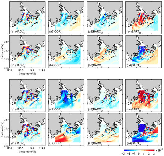 Distribution of the momentum balance terms for the surface layer in (a1–a4,b1–b4) Exp1, (c1–c4,d1–d4) Exp2. (a1–a4,c1–c4), and (b1–b4,d1–d4) represent U-direction and V-direction, respectively.