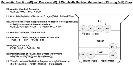 Naturally occurring Fe(III) films with rainbow reflection iridescence have been observed floating on the water surface of various spots covered with shallow water (e.g., edges of wetlands and creeks, standing water over soils). This natural phenomenon has become a scenic attraction and stimulated much curiosity. We pursued an experimental inquiry aimed at probing this interesting, curious natural wonder. As the first critical task, floating Fe(III) films were successfully generated in an assessable, controllable setting in our laboratory. This enabled us to establish this phenomenon reproducibly under controlled conditions and characterize the phenomenon over the entire span of the formation and transformation of the Fe(III) films. Our film generation method requires a few things: fresh soil (source for Fe(III) and microbes), glucose (energy source), and water in a container. The floating Fe(III) films as observed in the field occurred in ~1–3 day(s) on the water surface of the inundated soil mixed with the sugar. The Fe(III) films then grew from initial very thin, colorless, somewhat transparent films with rainbow reflection iridescence to colored thicker films and then to orange/orange-red/red crusts over the time. A comprehensive mechanistic picture was formulated to depict the formation of the Fe(III) films. Several sequential processes are operative. First, the Fe(III) (oxides, oxyhydroxides) in the soil is reduced to Fe(II) by the Fe(III)-reducing microbes during their anerobic respiration with Fe(III) as the electron (e−) acceptor after depletion of dissolved O2 in the water as a result of aerobic microbial respiration with O2 as the e− acceptor. The Fe(II), being soluble, then diffuses to the water surface where it is oxidized to Fe(III). Subsequently, the Fe(III) hydrolyzes and various Fe(III) hydrolysis products polymerize to stabilize. A polymeric model was created to account for the Fe(III) film transformation. The Fe(III) films are considered to transform from the dimers and trimers and linear polymers of Fe(OH)3 to Fe(III) polymer sheets (e.g., Fe(OH)3, FeOOH), to 3D Fe(III) polymers, and eventually to Fe2O3 colloid particles. This floating Fe(III) film phenomenon boasts an environmental chemical drama of redox cycling of Fe(III)/Fe(II) at soil/water and water/air interfaces coupled with Fe(II) transport from the inundated soil to the water surface followed by ultimate mineralization of the Fe(III) polymers. Our Fe(III) film generation method can be readily scaled up to supply Fe(III) films of rich varieties in thickness, size, morphology, and structure over the entire span of various stages of their formation and transformation as desired for various uses. This setup offers a platform needed for further controlled studies on the kinetics, mechanism, and process of abiotic and biotic nature involved in the Fe(III) film phenomenon and for exploration of versatile roles of the Fe(III) films as nanofilms in Fe(III)/Fe(II)-surface catalyzed chemical and photochemical reactions involving various natural and synthetic compounds.