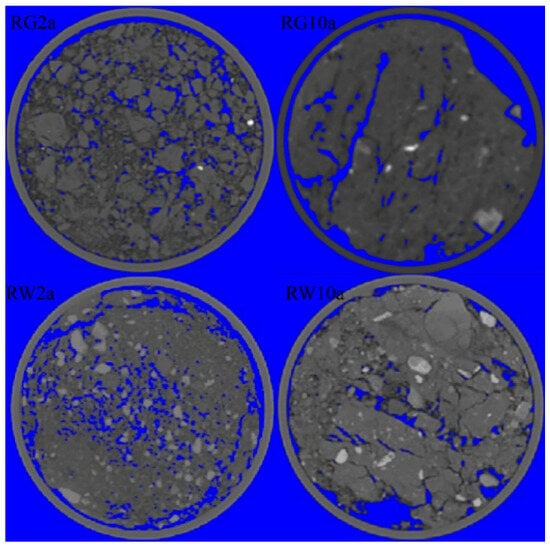 (2) CT Image Binarization: To begin with, the brightness and contrast of the image were improved through the equalization of the grayscale histogram. Subsequently, a 3D Gaussian blur filter was applied to reduce noise in the grayscale image. The core part of the soil column, measuring 46 × 46 × 300 (mm) was selected for study, taking into consideration the influence of the boundary of the soil column. Next, the image was binarized using the image-adjust plug-in of ImageJ 1.53c to produce a binary image containing only pores and soil []. The segmentation threshold for the pore and background was adjusted by comparing the binarized pore with the original pore image, aiming to maximize the conformity of the pore with the actual image [,,]. Finally, the binarized image was expanded and eroded to eliminate pores with a volume less than 0.001 mm3 to reduce noise and eliminate fine connections between pores. This step provided the basis for subsequent pore characteristic extraction. The resulting binarized pore image, with a diameter of >400 μm (CT scanning resolution) [], is illustrated in Figure 2 (where the blue color represents the pores). This image served as the foundation for generating the basic images for 3D visualization.