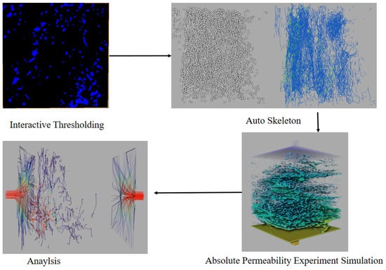To assess the permeability of soil pores, we utilized the absolute permeability module in Avizo2020 software to conduct simulations. Initially, we employed image binarization in ImageJ 1.53c, followed by importing it into Avizo2020 for interactive thresholding and subsequent skeletonization to enable absolute permeability simulation. The fluid viscosity coefficient was established at 0.001 Poise, with inlet input pressure set at 1 MPa and outlet output pressure at 0.75 MPa for the permeability simulation. Subsequently, Darcy’s law was applied to calculate permeability and streamlines were generated. In the visualization, colors denote flow rate, with red indicating rapid flow and blue representing slower flow. The distribution of streamlines corresponds to the pore structure, where increased pore space results in reduced streamline density. The process is depicted in the flow chart in Figure 3.