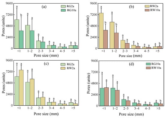 Changing law of 2D pore size in different reclamation years and reclamation modes. Note: Different lowercase letters represent significant differences between the same pore sizes for different treatments (p < 0.05). (a–d) are comparisons of different reclamation years and different modes, respectively.