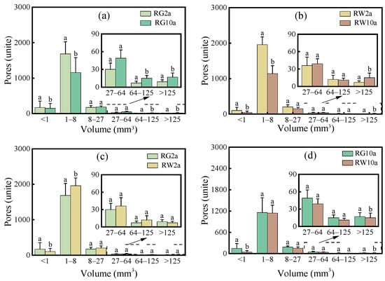 When considering different reclamation years, the number of 3D macropores (>125 mm3) in the RG10a and RW10a treatments exhibited increases of 88.89% and 114.29%, respectively, compared to the RG2a and RW2a treatments. This trend implies a gradual enhancement in the number of macropores with advancing reclamation years. In terms of different reclamation modes, the count of macropores (>125 mm3) saw an increase of 28.58% and 13.33% in the RG2a and RG10a treatments compared to the RW2a and RW10a treatments, respectively. This suggests that the grassland reclamation mode is more conducive to improving the macroporosity number, although the efficacy of different reclamation modes in enhancing macroporosity is slightly lower compared to varying reclamation years. Notably, significant differences in pore size existed among the four treatments at all levels.
