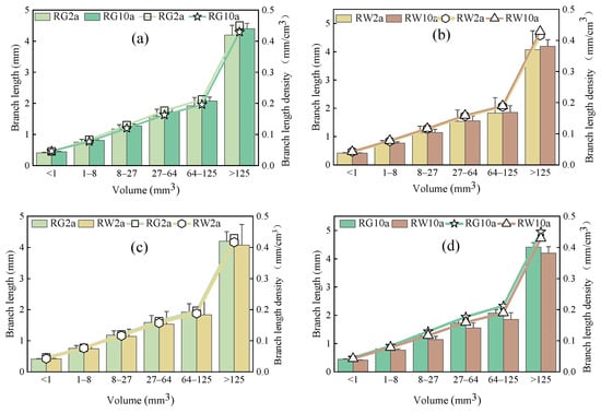 According to the data presented in Figure 6, the RG10a treatment exhibited the highest values for branch length and branch length density across all pore size intervals, indicating that this treatment led to the formation of a more favorable soil pore network structure.