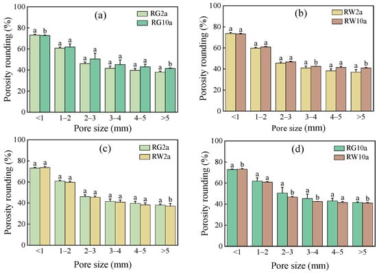 Changing the law of pore rounding rate in different reclamation years and reclamation modes. Note: Different lowercase letters represent significant differences between the same pore sizes for different treatments (p < 0.05). (a–d) are comparisons of different reclamation years and different modes, respectively.