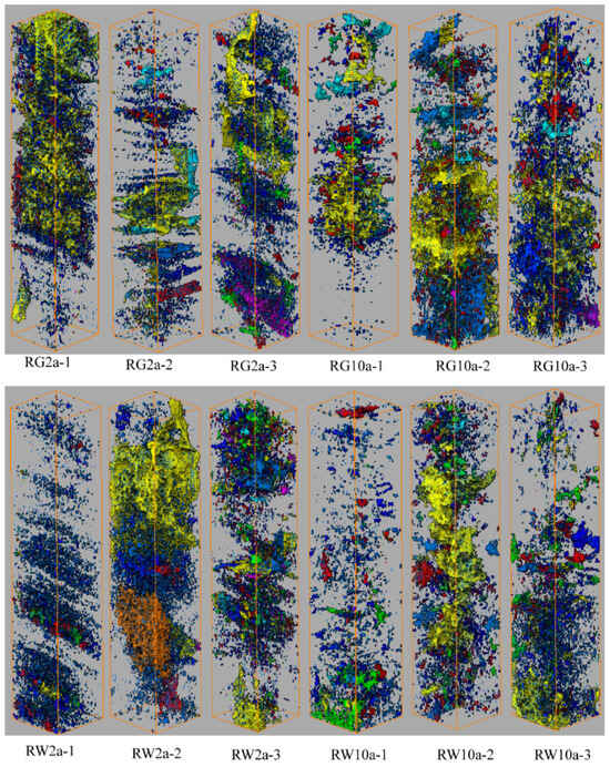 To accurately depict the three-dimensional characteristics of soil pores across various reclamation years and types of reclamation modes, a three-dimensional reconstruction diagram illustrating the spatial structure of soil column pores was generated using the rendering feature of AVIZO2020 software. Different colors within the diagram represent soil pores of varying sizes (refer to Figure 8). Within the top 0–30 cm of soil depth, the pores in the RG2a treatment exhibited an inclined laminar distribution, with many displaying a lamellar structure. Specifically, within the 0–20 cm layer, the RG10a treatment exhibited an abundance of yellow pores (>5 mm). Moving deeper into the 20–30 cm layer, the RG10a treatment displayed a denser distribution of pores, obscuring the clarity of elongated strip-shaped pores due to their coverage. Conversely, the RW2a treatment showcased a leftward-inclined laminar structure with more scattered pores and fewer yellow pores (>5 mm). The pore distribution in the RW10a treatment appeared more sporadic, with yellow pores (>5 mm) concentrated in the middle and bottom layers. Overall, all four treatments predominantly featured dark blue pores (<1 mm) in their pore distributions.