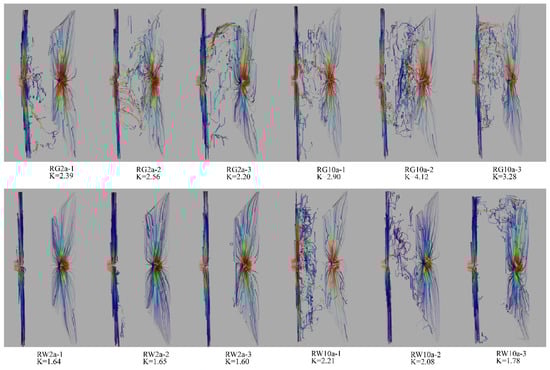 The RW2a treatment primarily exhibits lateral flow, whereas the RW10a treatment allows for vertical flow; however, the distribution of its flow lines is not uniform. In contrast, both the RG2a and RG10a treatments feature more flow lines capable of vertical flow, with the RG10a treatment displaying relatively more uniform and predominantly vertical flow lines. Across different reclamation years, the number of flow lines in the 10a treatment exceeded those in the 2a treatment. Regarding different reclamation modes, the RG treatments displayed more consistent flow lines and a higher occurrence of vertical flow compared to the RW treatments. These observations suggest that the grassland reclamation modes enhance the complexity of soil pore structure and fluid permeability as the reclamation years progress, particularly evident in the RG10a treatment.