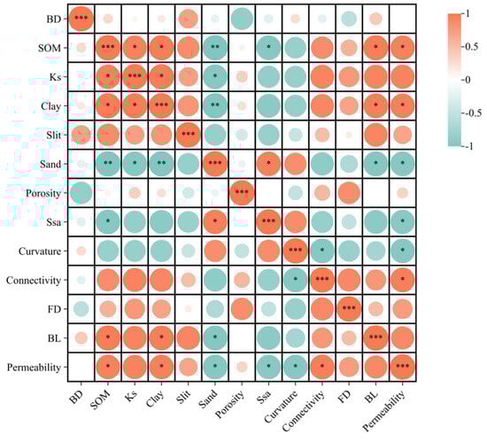 Correlation analysis of soil pore parameters. Note: ***, ** and * represent 1%, 5% and 10% significance levels, respectively.