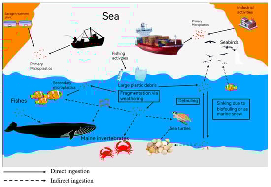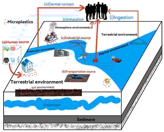 Plastic, due to its exceptional characteristics (e.g., lightweight, durable, cost-effective, and malleable), is extensively utilized across various sectors including daily life, aerospace, military, agroforestry, and industry [1]. However, the widespread use of plastics has led to a significant environmental concern: the proliferation of plastic waste. As plastic waste is exposed to environmental elements, it undergoes degradation, both physically and chemically, resulting in the formation of smaller plastic fragments [2,3]. Plastic fragments are categorized as microplastics when their diameter is less than 5 mm. People’s attention has gradually been drawn to its accumulation in the environment as a result of the difficulty of natural degradation and recycling [4,5,6,7,8]. Numerous studies in recent years have demonstrated the presence of microplastic pollution in a variety of environments all over the world, including food, bottled water, tap water, wastewater, seawater, cropland, and air. For example, microplastic pollution has been found in the Stockholm Archipelago [9], the Galápagos Archipelago [10], Türkiye [11], and freshwater rivers in Shanghai, China [12]. The majority of these microplastics are either released directly or indirectly into environments such as the ocean, as shown in Figure 1. The diverse causes of the formation of microplastics were primarily born through the processes of human use (such as personal care products and synthetic textiles), transportation (such as abrasion of synthetic rubber tires), and industry (for example, plastic containers). These microplastics released into various environments eventually enter the organism through various pathways, including inhalation, ingestion, and skin contact [13]. Under a variety of influences, these microplastics will engage in environmental processes such as accumulation, transformation, and fragmentation. Numerous review articles on the sources of environmental microplastics have been published in recent years [14,15,16,17,18,19,20,21,22,23]. However, the majority of these studies and summaries were not very comprehensive, focusing only on a single aspect of the terrestrial, marine, freshwater, and atmospheric environments, while only a few overviews incorporate multiple environmental sources. Microplastics are now being found to be a serious threat to freshwater, terrestrial ecosystems, and human bodies. Microplastics can also carry a wide range of toxic contaminants like heavy metals [24,25], polycyclic aromatic hydrocarbons (PAHs) [26,27], polychlorinated biphenyls (PCBs) [28,29,30], organochlorine pesticides (OCPs) [31,32], polybrominated diphenyl ethers (PBDEs) [33,34], bisphenol A [35,36], and others. A large number of microplastics have been identified as toxic to living organisms. Furthermore, microplastics can be transferred and concentrated along the food chain, thereby posing an additional threat to human health. The presence of diverse microplastic types has already been documented in food and drinking water sources [37,38,39,40,41]. Microplastics that have been found in human feces as well as in blood clots [42,43,44]. These studies not only emphasize the sources and distribution of microplastics but also highlight their potential impacts on the environment and biohealth, prompting people to take action to reduce plastic pollution and seek more effective recycling and treatment methods.