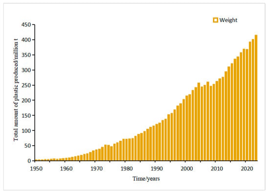 Plastics are utilized in many ways across a vast array of sectors from coverings, coatings, greenhouses, wiring for packaging, containers, lids, bags, and films. In 1950, the world produced only 2 million tons per year. Following nearly 70 years of uninterrupted growth, by 2019, the annual production had grown by approximately 230 million tons, reaching a peak of 460 million tons [47]. From 1950 to 2023, the global annual production of plastic has generally shown an upward trend (Figure 2). The persistence of microplastics in the environment has been documented to range from hundreds to thousands of years. Among the various plastics, polyethylene (PE, 36%), polypropylene (PP, 21%), polyvinyl chloride (PVC, 12%), polyethylene terephthalate (PET), polystyrene (PS), and polyurethane (PUR) (<10%) are the most produced polymer varieties. Together, these types of plastics accounted for about 92% of total global plastic production [47]. The physicochemical characteristics and potential applications of these materials are presented in the following Table 1.