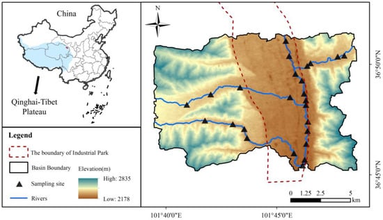 The Qinghai–Tibet Plateau is known as the “Headwater of Asia”, because many rivers in southeast area originate from here []. In recent years, people have recognized that it can protect and construct the national ecological security barrier. Freshwater resources are critical resources following energy resources. The level of water resource development on the Qinghai–Tibet Plateau is below the average level in China due to the constraints of the environment, transportation, and social–historical factors. The Qinghai–Tibet Plateau is less influenced by human activities and has fewer pollutants. It is known as “the last pure land on earth”. However, the ecological environment has become more sensitive and fragile due to unique environmental conditions and human activities such as geothermal and mineral exploitation, urban sewage, and wastewater discharge. Production activities in the industrial park in this special geographical environment may exacerbate this environmental vulnerability. Moreover, the agricultural soil is usually irrigated by the surrounding water. Toxic metals may accumulate in croplands and enter the human body through the food chain. Thus, it is necessary to monitor river water quality around industrial parks and explore the industrial activities’ impact on water quality. Previous studies have shown that the water quality indexes around industrial parks are significantly higher than other sites, with water quality decreasing to “Undrinkable”. Thus, exploring the connection between industrial parks and water quality is an innovative approach. Our objectives are to (1) examine the spatial distribution of heavy metal concentrations in water around a typical industrial park; (2) categorize water quality indicators using SOM; (3) identify the relationship between environmental auxiliary variables and water quality indexes using the Boruta algorithm; and (4) assess the water quality risk using IFN-SPA. Our findings may provide enlightenment for making policies to improve environmental conditions around the industrial park on the Qinghai–Tibet Plateau.