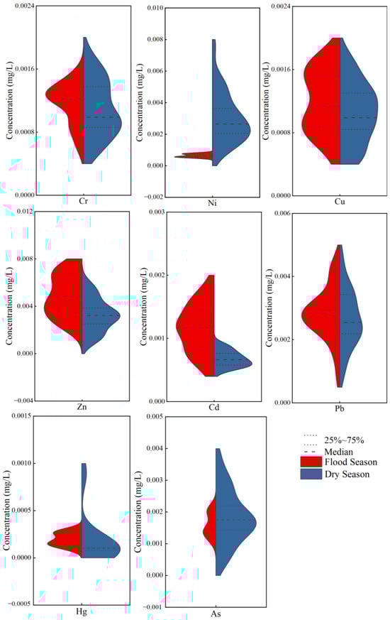 The statistical data on water quality during the flood and dry seasons are presented in Table 1 and Figure 2. Significant differences were observed between the average concentrations of pollutants in these two seasons. The average concentration of Cr in the flood season was 0.00116 ± 0.00026 mg/L, which was above the average value of the dry season, but still fell within the Class I standard for surface water quality, as defined by GB3838-2002 []. Cr with the CV% (22.65% and 32.73%) indicated a certain degree of variability. The average Cu of the flood season was 0.00119 ± 0.0004 mg/L, with most monthly Cu levels exceeding this mean. And sampling sites in the dry season also presented the same pattern (Figure 2). This difference may reflect the fact that heavy metals through wastewater discharge or runoff can enter into the river. For example, pollution in the Diaojiang River is serious because there are mining and smelting activities in this area and its karst landforms [,]. The mean Cd concentration in the flood season was 0.00115 ± 0.00038 mg/L, which corresponded to the Class II water quality standard. Such water quality is generally suitable for drinking, aquaculture, and recreational uses like swimming, though continuous monitoring is required to prevent deterioration. However, the maximum Cd concentration reached 0.00190 mg/L, indicating severe contamination near specific sampling sites, which warrants closer attention. The CV% of Ni displayed the smallest variation among all water quality metrics, suggesting consistently low Ni levels in surface water. In terms of Pb, the concentrations were low and seemingly unthreatened, but CV% was higher than other heavy metals which reflected their greater dispersion in this area and the need to be aware of Cd contamination in other places. Heavy metal contamination in water bodies can devastate aquatic ecosystems by killing fish and shrimp, causing water to stink and eutrophication, and finally collapsing aquatic ecosystems []. Previous studies have indicated that many types of industries are concentrated near river systems, where industrial operations release heavy metals into the environment via effluents and emissions [,]. Elevated Cd concentrations in rivers may result from the presence of Cd in raw materials used during production processes in certain enterprises. In the upper reaches of the Yellow River, industries such as electroplating, tanning, chemical manufacturing, metallurgy, and refractory material production contribute to Pb, Cd, Cr, and As contamination through wastewater discharge [,,]. Additionally, As and Pb concentrations were notably high in wastewater generated by thermal power plants [,]. On the other hand, agriculture can influence the river water quality through planting and breeding []. Natural factors (i.e., climate, geography, terrain, etc.) and human factors (i.e., pollution discharge) caused by regional differences lead to different management needs and water quality classifications []. Different seasonal climate factors have different impacts on water quality. The implementation of differentiated management of regional water quality objectives can better adapt to the actual situation in different seasons.
